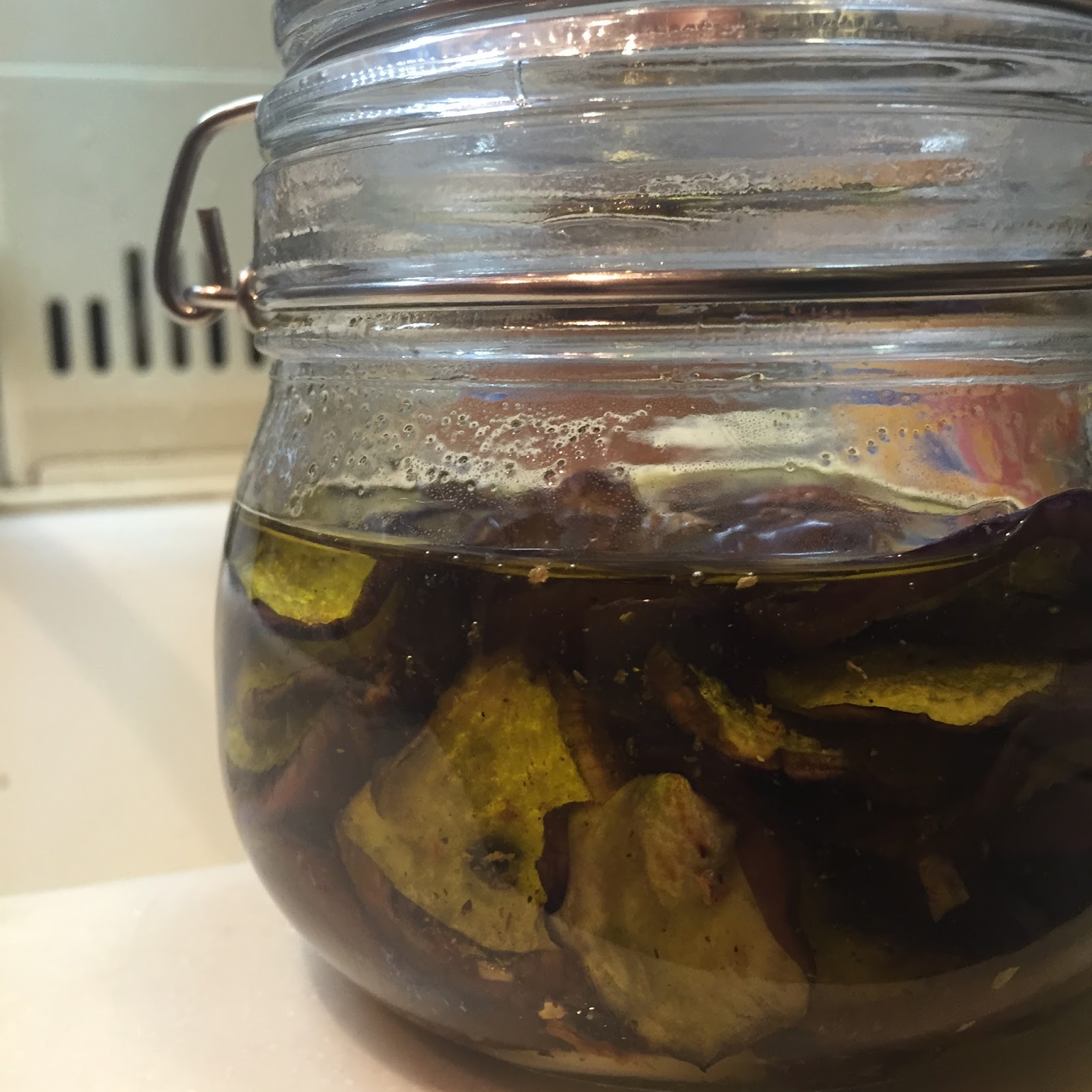 The pickled eggplant went extremely well with the French bread. I made a small batch last night and I ate the whole thing today already. Not wanting to waste the olive oil, I bought more eggplants today for a second batch! I am not gonna go into all the details but I will share my tweaks to the original recipe.